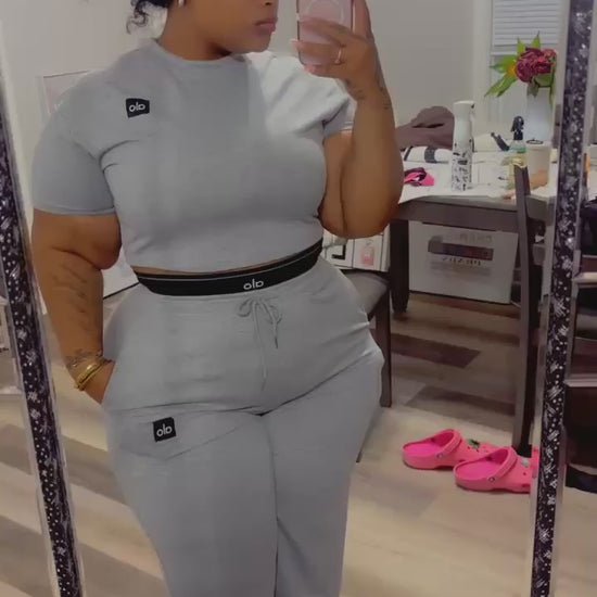 Super cute comfy active set. Featuring oversized crop and nice flowing over legged pants with draw string.