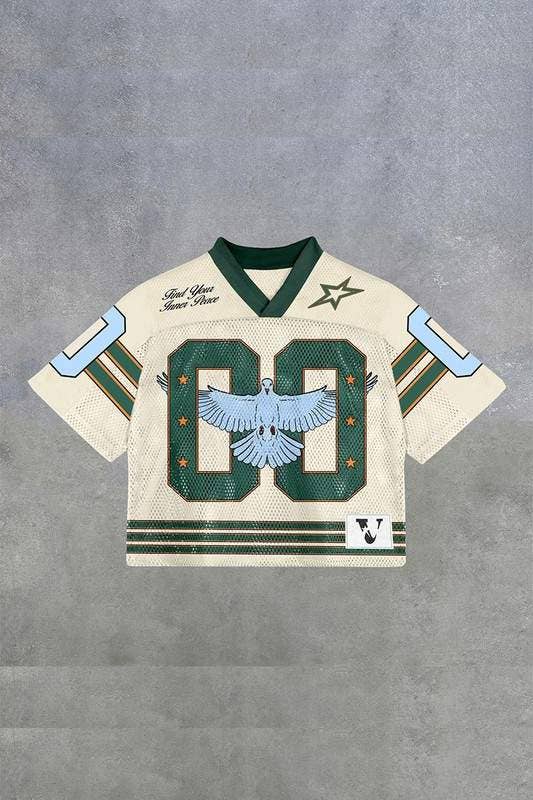 A sporty cropped jersey top featuring a bold “66” varsity graphic and contrast striping for a standout streetwear vibe.