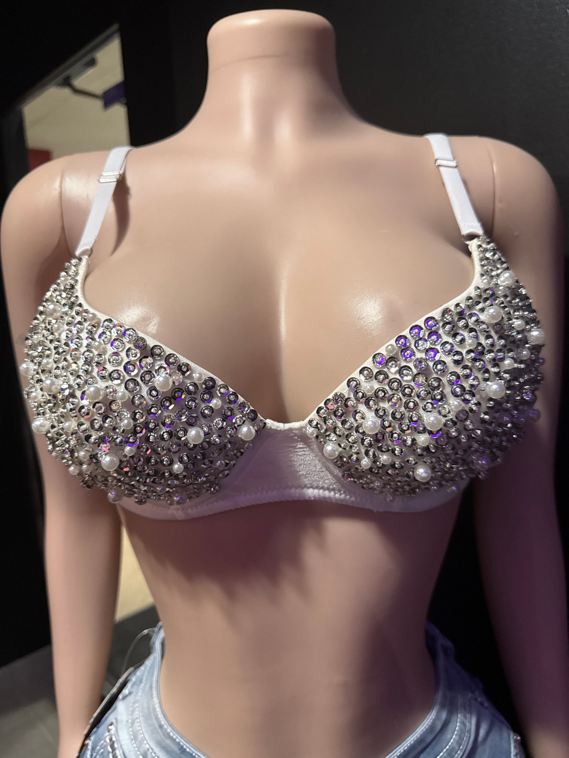 - Material: Satin-like fabric base with sequin, rhinestone, and pearl embellishments