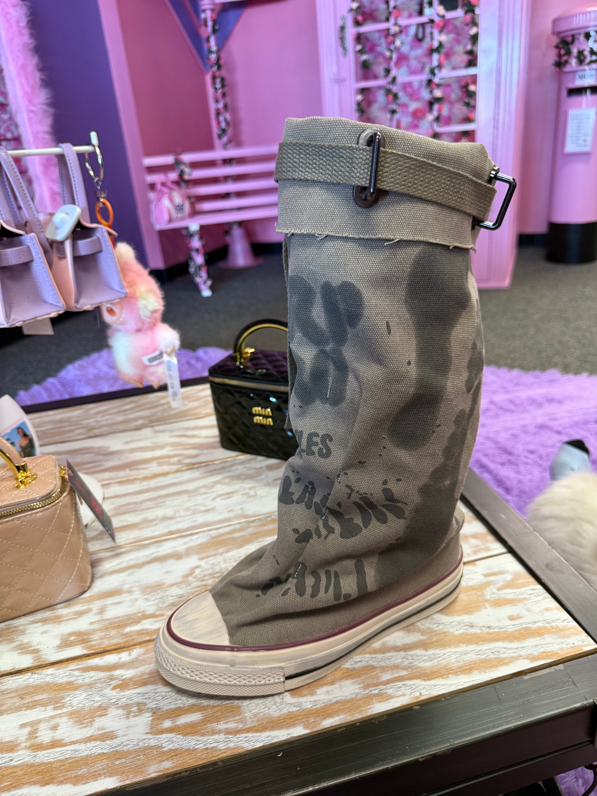 - Design: Oversized high-top sneaker-boot hybrid with graffiti-style black-and-white print and buckle detail.