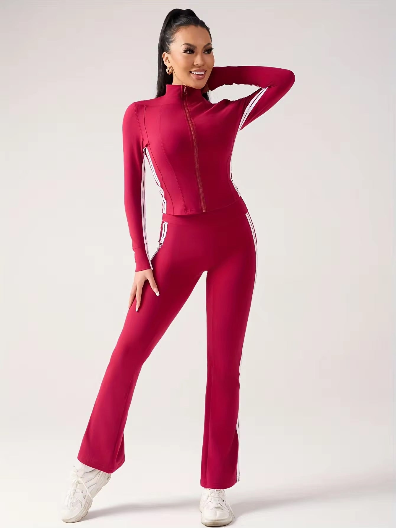 The Luxe Stripe Zip-Up Set combines sporty style with a sleek, sculpted fit. Featuring a high-neck zip-up jacket and matching flared pants with contrast side stripes, this two-piece set is designed to accentuate your curves while offering all-day comfort. Made from a soft, stretchy blend, it’s perfect for casual outings, travel, or athleisure looks that turn heads. Available in brown, cranberry.