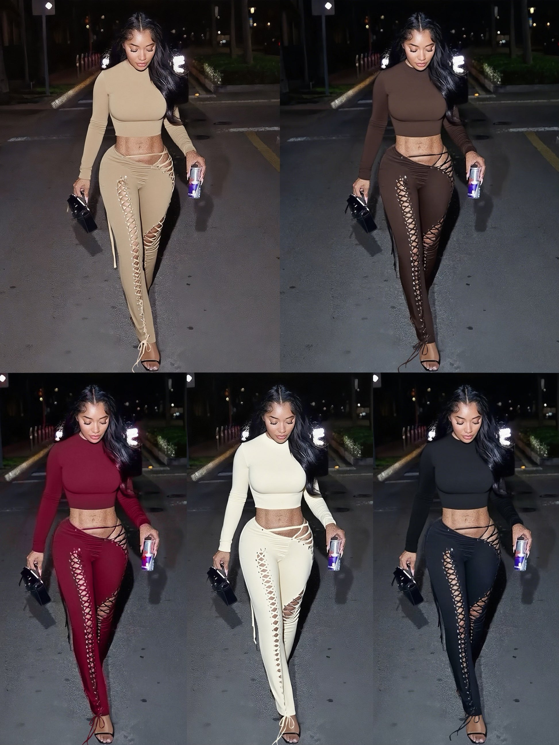 Turn heads and own the night in the Laced Temptation Two-Piece Setfrom Devine Diva Fashion. This bold, body-hugging ensemble features a sleek long-sleeve crop top paired with high-waisted lace-up pants that accentuate every curve. The daring lace-up detailing along the legs adds a sultry edge, perfect for a night out or a statement look that demands attention.